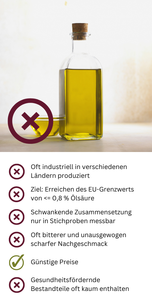 Die meisten Olivenöle im Supermarkt tragen in etwa die Bezeichnung “hergestellt aus Olivenölen aus Ländern der Europäischen Union” auf dem Etikett. Bei der Herstellung werden verschiedene Olivenöle unterschiedlicher Qualität verschnitten um die chemischen Grenzwerte der Europäischen Union für die Bezeichnung “extra nativ” einzuhalten.